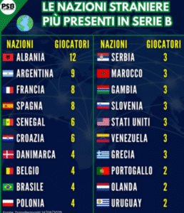 Në listë përfshihen edhe vende të tjera si Serbia, Maroku, Gambia, Sllovenia, SHBA dhe Venezuela, secila me nga 3 futbollistë në Serie B. Ndërkohë, Portugalia, Holanda dhe Uruguai kanë nga 2 përfaqësues, përcjell tch.